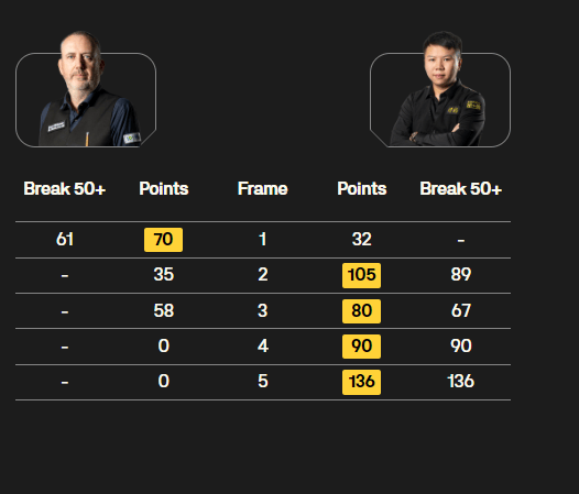 全场比赛,周跃龙打出一杆破百(136)和三杆50+(89、67、90),马克-威廉姆斯仅在首局打出一杆50+(61)。