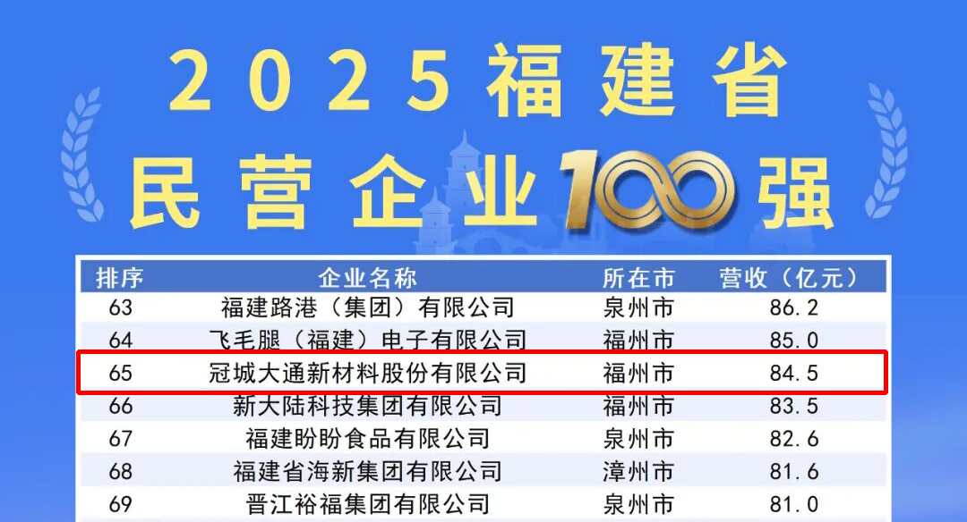 9月28日,由福建省工商联、宁德市人民政府共同主办的2025福建民营企业100强发布暨宁德市产业招商推介会在宁德市召开。在会上权威发布的榜单中,冠城大通新材料股份有限公司凭借卓越的综合实力与强劲的创新活力,成功荣膺“2025福建民营企业100强”及“2025福建创新型民营企业100强”两项荣誉。