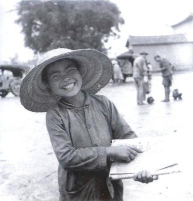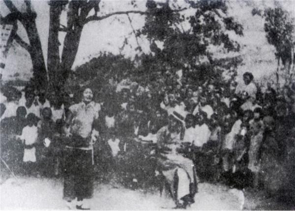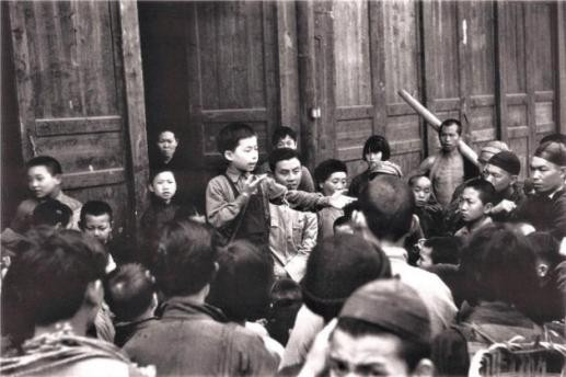 小学抗敌宣传队在乡镇进行抗日宣传。