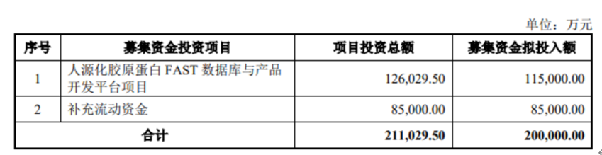 作为重组胶原蛋白行业的重要参与者,锦波生物本次发行募集资金中的11.5亿元将用于人源化胶原蛋白FAST数据库与产品开发平台项目,其余8.5亿元用于补充流动资金。